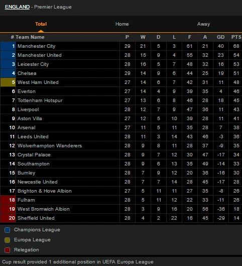 Bảng xếp hạng Premier League: