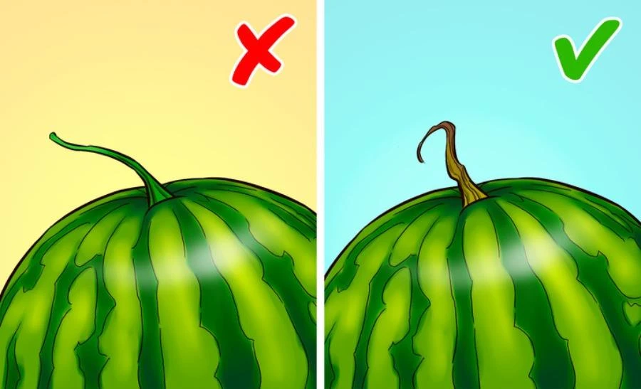 Dưa hấu: Để chọn dưa hấu ngon, hãy nhìn vào cuống của chúng. Nếu dưa có cuống khô, màu nâu điều đó có nghĩa là dưa đã chín.