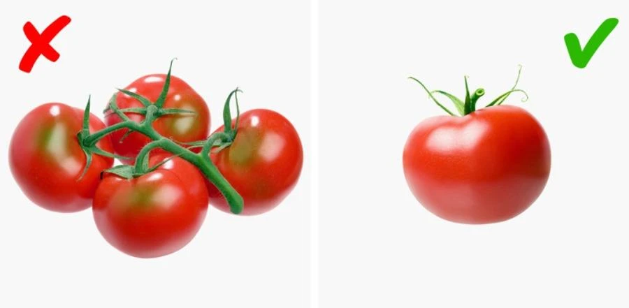 Màu sắc của cà chua tốt nên đồng nhất và hài hòa, không nên có đốm màu xanh lá cây. Hơn nữa, mùi của nó nên dễ chịu. Không nên chọn cà chua nếu bạn nhấn vào nó mà không thấy dấu vân tay của bạn để lại. Cà chua tốt nên mềm một chút khi chạm vào.