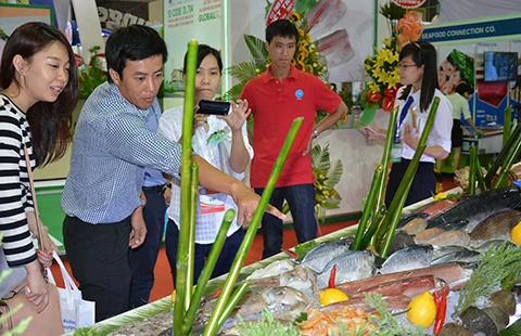 Khách hàng quan tâm đến sản phẩm thủy sản tại hội chợ triển lãm quốc tế thủy sản Việt Nam 2015 (diễn ra từ ngày 24 đến 26-8 tại quận 7, TP.HCM). Ảnh: QUANG HUY