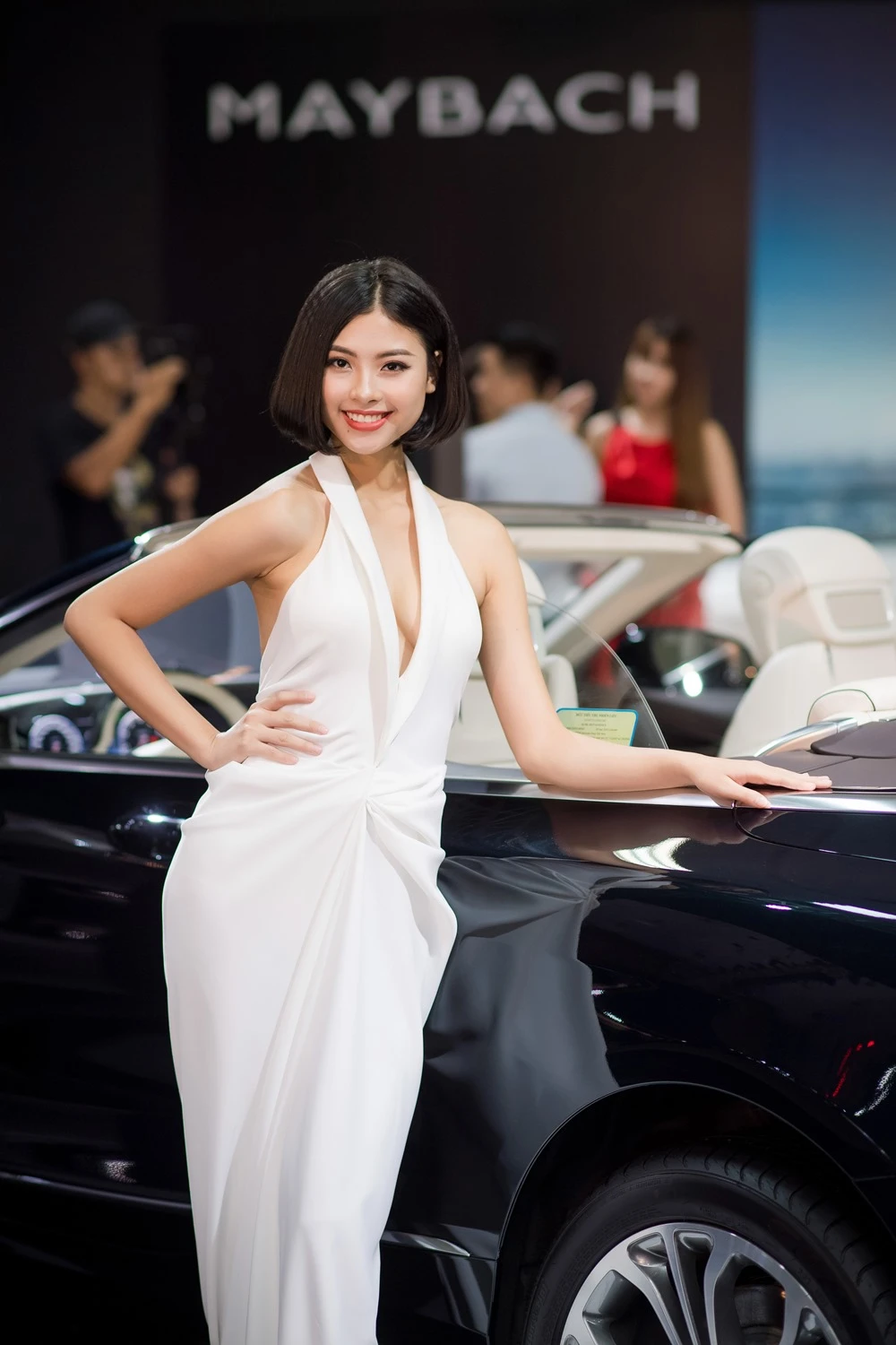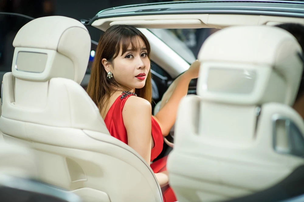 Dàn chân dài với tông màu trắng sang trọng bên cạnh mẫu xe sang
