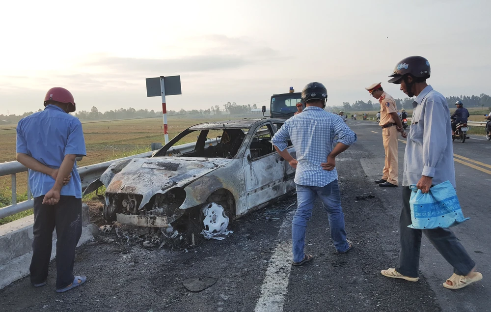 Tại hiện trường, chiếc xe bị cháy trơ khung, mùi nhựa cháy vẫn còn bốc lên nồng nặc. Mảnh kính chắn gió vỡ văng ra khắp mặt đường.