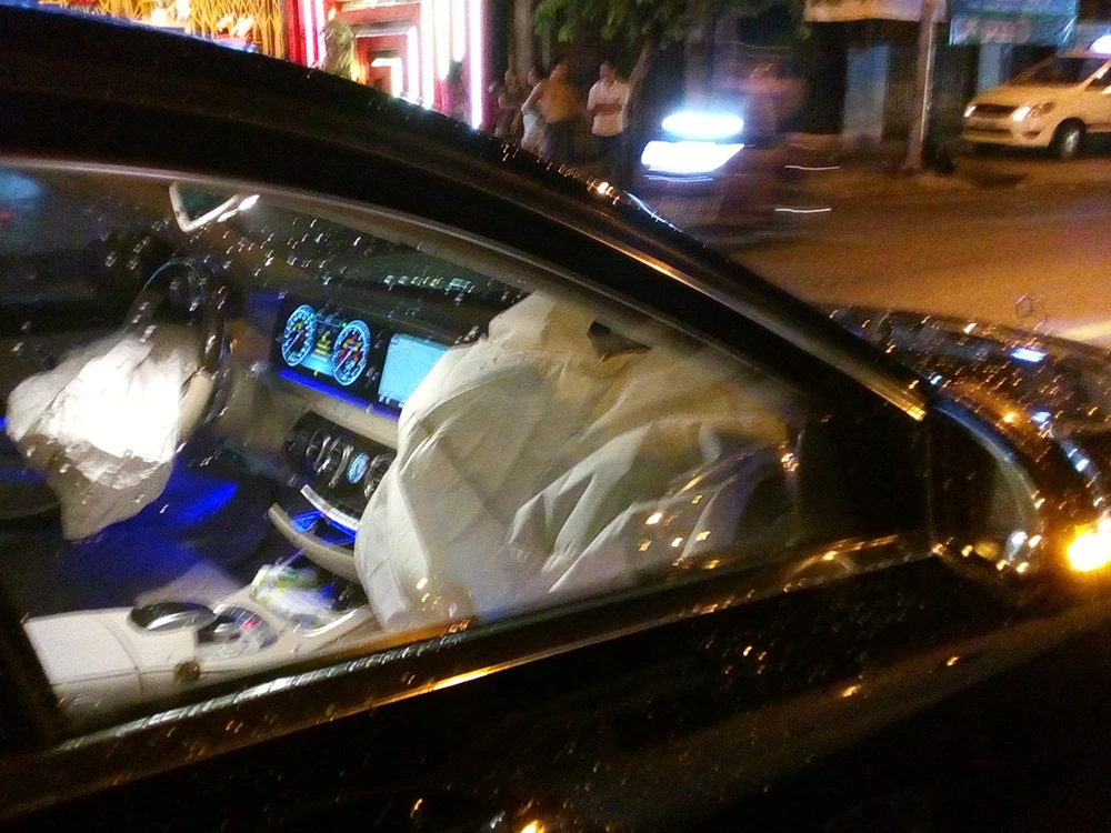 Tại hiện trường, xe máy của nam thanh niên hư hỏng nặng, nhiều mảnh vỡ vương vãi trên mặt đường. Ô tô hạng sang dừng cách đó nhiều mét bị bung túi khí, nổ bánh trước, hư hỏng phần đầu.
