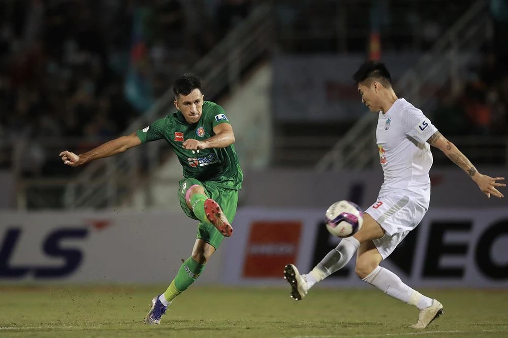 Cú sút tuyệt đẹp của Merlo đánh gục HA Gia Lai. Ảnh: ANH PHƯƠNG