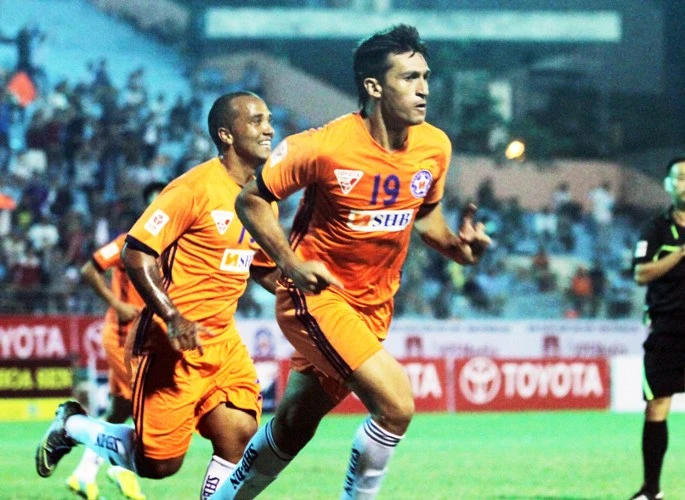 Niềm vui của Merlo (số 19) sau khi ghi bàn thắng, giúp SHB Đà Nẵng có chiến thắng thứ ba liên tiếp sau ba vòng đấu.