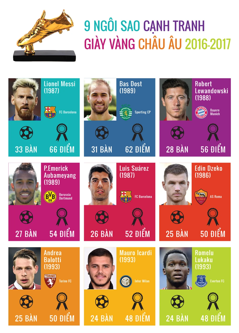 (PLO)- Lionel Messi đang dẫn đầu danh sách cuộc đua giành danh hiệu chiếc giày vàng châu Âu, với 33 bàn thắng. Danh sách cạnh tranh đang dần nóng hơn với sự theo đuổi khốc liệt của các cầu thủ khác như: Bas Dost (31 bàn), Lewandowski (28 bàn),...