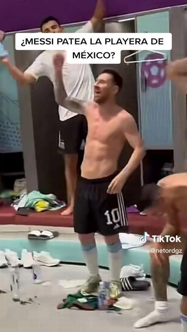Sau trận Argentina thắng Mexico 2-0 ở vòng bảng World Cup 2022, Messi đã đổi áo đấu với một cầu thủ Mexico. Trong phòng thay đồ sau trận đấu, cả đội Argentina ăn mừng cuồng nhiệt. Thời điểm đó, Messi đang cởi giày nên đã vô tình đá nhẹ vào chiếc áo đấu của Mexico đang nằm trên sàn.