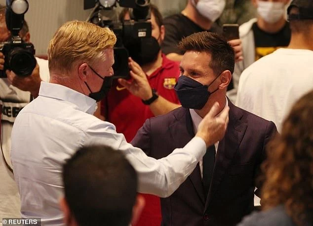 … HLV Ronal Koeman chia sẻ với Messi. ẢNH: REUTERS