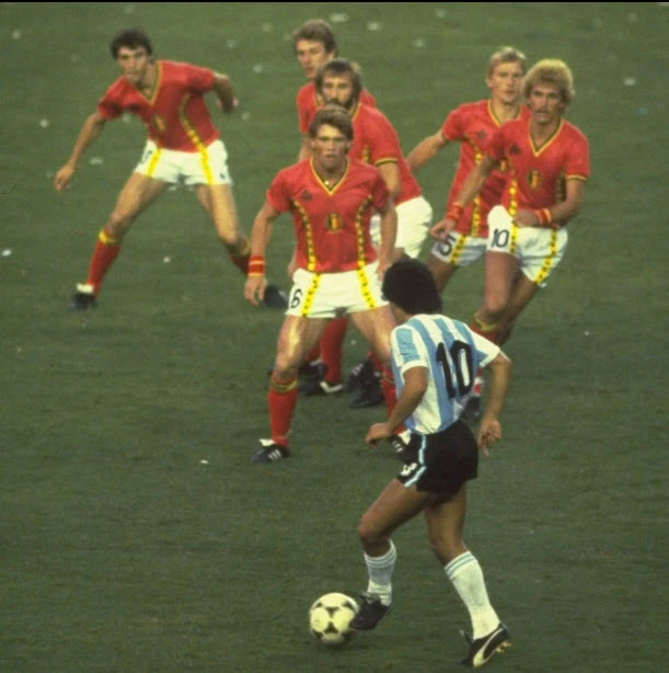 Bức ảnh mang tính biểu tượng của Maradona trong trận Argentina đối đầu với Bỉ ở World Cup 1982. ẢNH: THE SUN