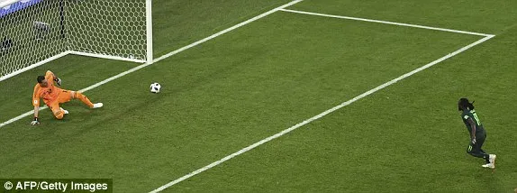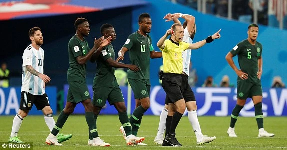 Trọng tài Cuneyt Cakir chỉ ngay vào chấm 11m và phạt thẻ vàng Mascherano bất chấp sự phản ứng của cầu thủ Argentina. Phút 51, trên chấm 11m, Moses bình tĩnh sút bóng đánh lừa thủ thành Armani ghi bàn san bằng tỉ số 1-1 cho Nigeria.