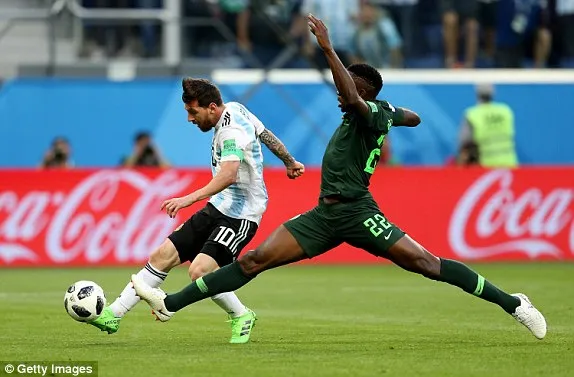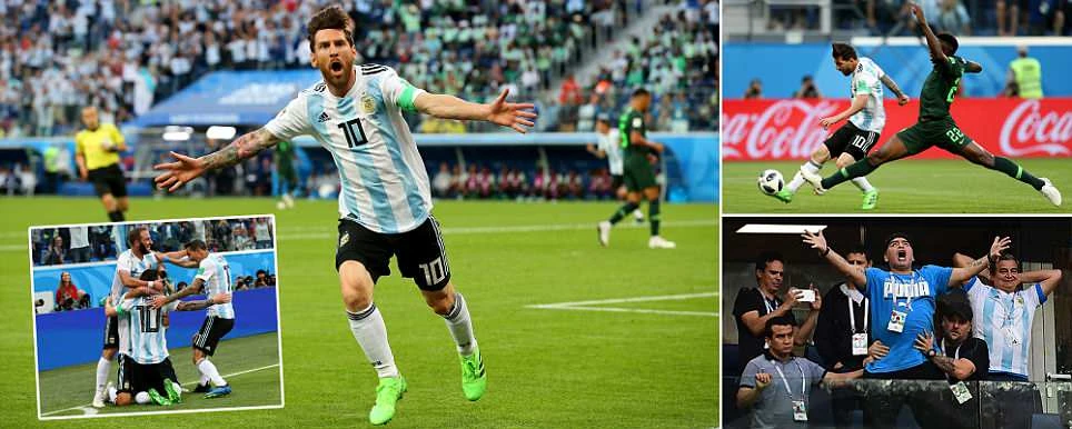 Ngay phút 14, Messi đã khai thông thế bế tắc cho Argentina đồng thời giải tỏa áp lực cho chính bản thân anh bằng một bàn thắng siêu phẩm. Nhận đường chuyền dài vượt tuyến cực kỳ chuẩn xác của Banega, Messi khống chế bóng gọn gàng rồi đẩy bóng một nhịp trước khung tung cú sút đầy uy lực xé lưới thủ thành Uzoho mở tỉ số 1-0 cho Argentina.