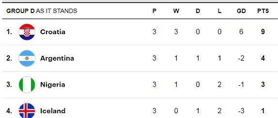 Những phút còn lại, Nigeria dù cố gắng đẩy cao đội hình nhưng vẫn không thể làm gì hơn và đành chấp nhận thua cuộc với tỉ số 1-2. Ở trận đấu cùng giờ, Croatia vượt qua Iceland với tỉ số 2-1. Với kết quả này, Argentina lách qua khe cửa hẹp cán đích ở vị trí thứ hai vào vòng knock-out.