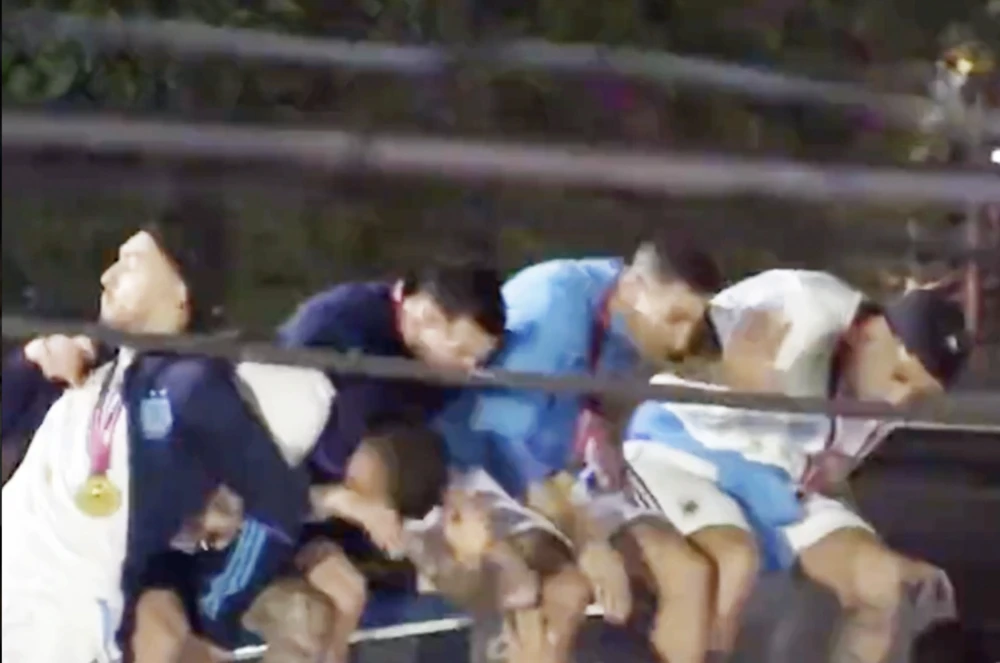 | Cận cảnh các cầu thủ Argentina suýt gặp nạn rớt khỏi xe buýt vì vướng dây cáp. ẢNH: VIVO |