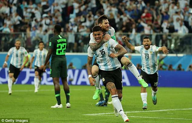Messi nhảy lên người Rojo ôm ghì cổ sau khi ngôi sao của MU ghi bàn quyết định cho Argentina.