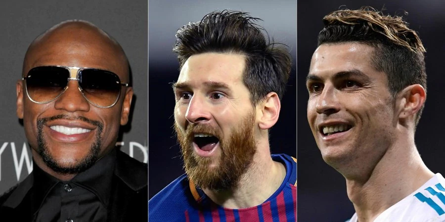 Hai siêu sao hàng đầu trong thế giới bóng đá mà thu nhập mỗi người một năm qua chưa bằng nửa tay đấm Mayweather. Thậm chí cả Messi và Ronaldo gộp lại cũng còn thua xa Mayweather.