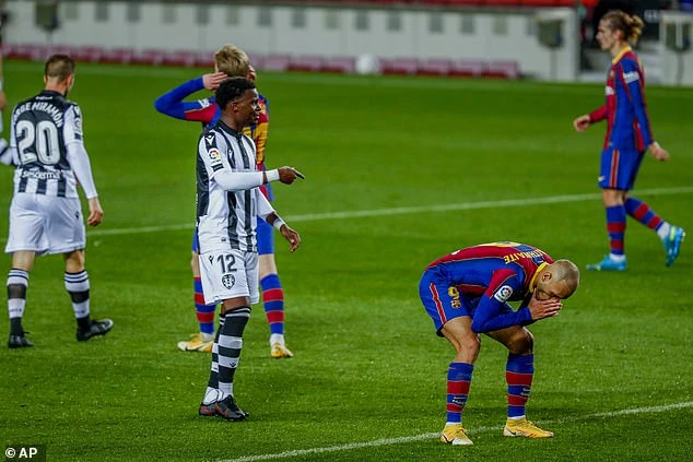 Các cầu thủ của Barca tiếc nuối khi cơ hội ăn bàn đều bị thủ môn của Levante ngăn cản. Ảnh: AP.