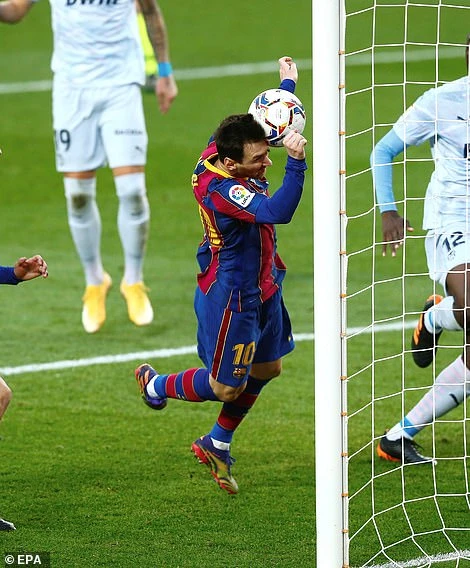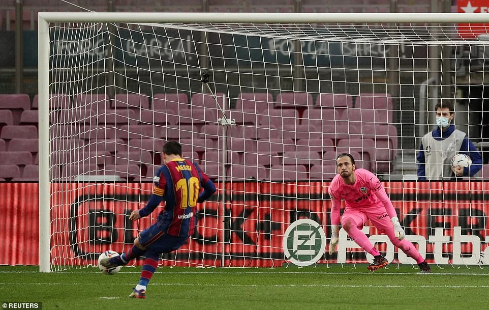 Trên chấm 11m, Messi sút bóng bị thủ môn Domenech đoán đúng hướng đẩy ra nhưng Alba kịp có mặt tạt vào cho chính Messi sửa sai đánh đầu cận thành ghi bàn thắng gỡ hòa 1-1 cho Barca.