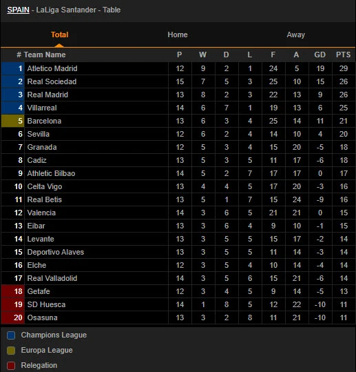 Bảng xếp hạng La Liga: