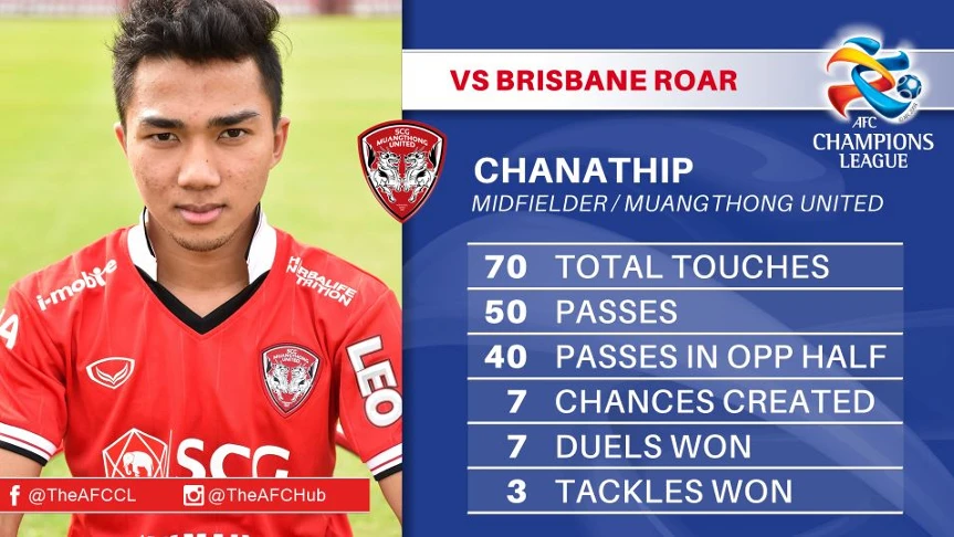 Bản thân "Messi Thái" cũng bảy lần sút cầu môn chính xác nhưng thủ môn Jamie Young của đội Brisbane Roar quá xuất sắc. Các thông số kỹ thuật đều cho thấy chính "Messi Thái" là người “dẫn đầu” trong việc Muangthong tạo ra một thế trận tốt để cầm hòa Brisbane Roar. Khả năng cầm bóng, óc quan sát, cầm trịch trận đấu của Chanathip đã làm cho Brisbane Roar không thể áp đảo thế trận nhiều hơn dẫn đến Muangthong chia điểm thành công với chủ nhà.