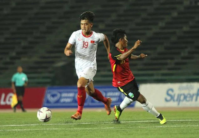 Trần Danh Trung đi bóng qua mặt hàng thủ Đông Timor.