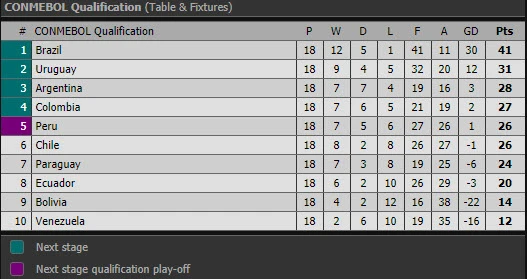 Như vậy 4 đội Brazil, Uruguay, Argentina và Colombia giành 4 suất đi thẳng đến Nga sang năm. Peru xếp thứ 5 phải đá play-off.