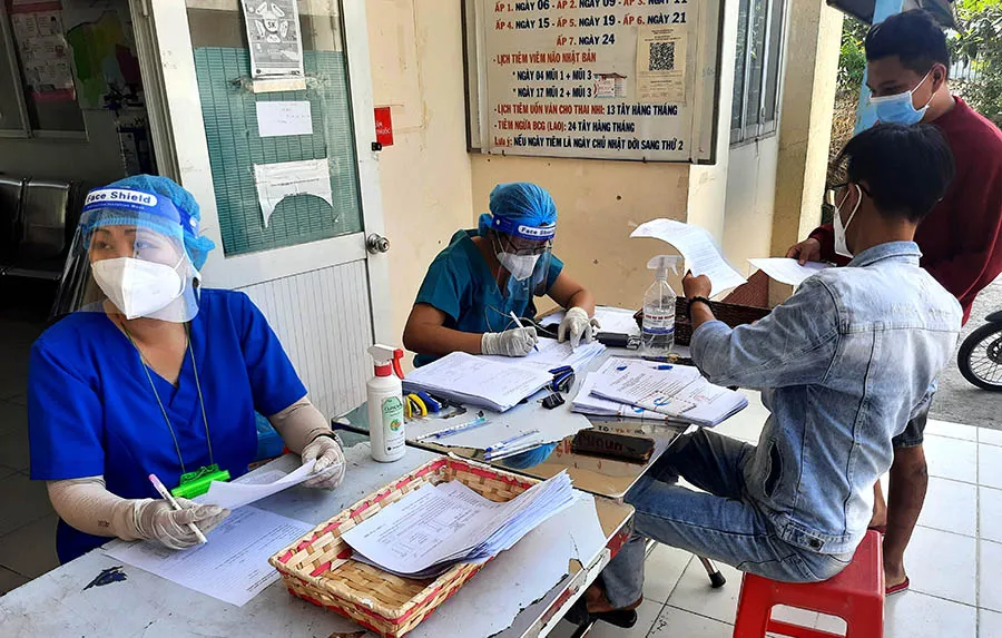 Nhân viên Trạm y tế xã Đông Thạnh, huyện Hóc Môn, TP.HCM hướng dẫn khai báo y tế cho F0. Ảnh: TRẦN NGỌC