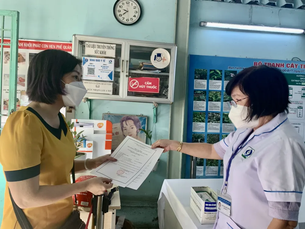 Chị Nhiêu xin giấy hoàn thành cách ly và chứng nhận nghỉ việc hưởng bảo hiểm xã hội ở trạm y tế phường 11 quận 5. Ảnh: HL
