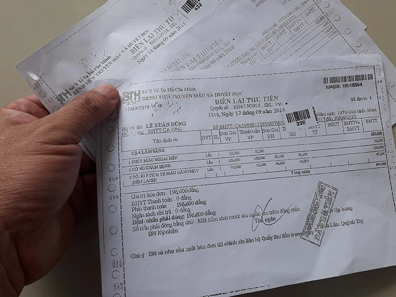 Theo ông Dũng, mới đây ông đến khám ở BV Truyền máu và Huyết học với tổng chi phí khám bệnh và xét nghiệm hơn 600.000 đồng. Sau khi đóng tiền, BV đưa ông ba biên lai thu tiền. Ông đem biên lai về cơ quan đề nghị thanh toán trực tiếp chi phí khám chữa bệnh nhưng không được thanh toán vì muốn thanh toán phải có hóa đơn tài chính, biên lai thu tiền không có giá trị.