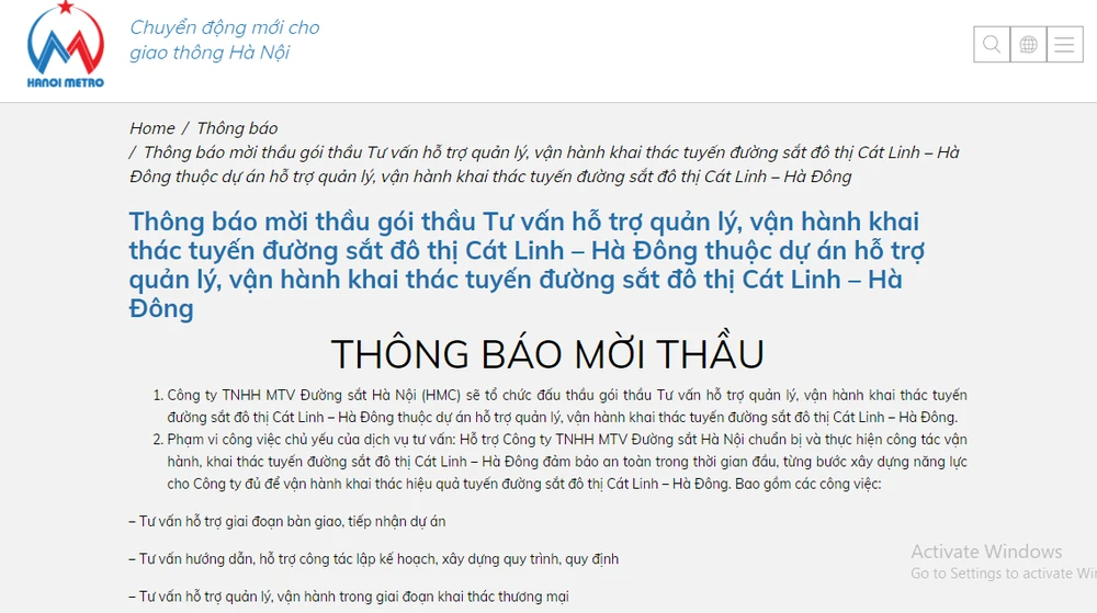 Metro Bắc Kinh trúng thầu với số tiền 5,1 triệu USD. Ảnh: Metro Hà Nội thông báo mời thầu quốc tế.