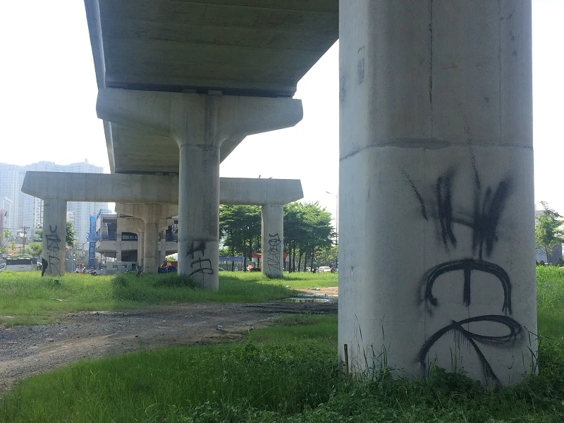 Mặc dù có những đoạn được rào bằng thép xung quanh nhưng vẫn xuất hiện các hình vẽ graffiti đủ màu sắc trên các trụ đỡ dọc tuyến metro.
