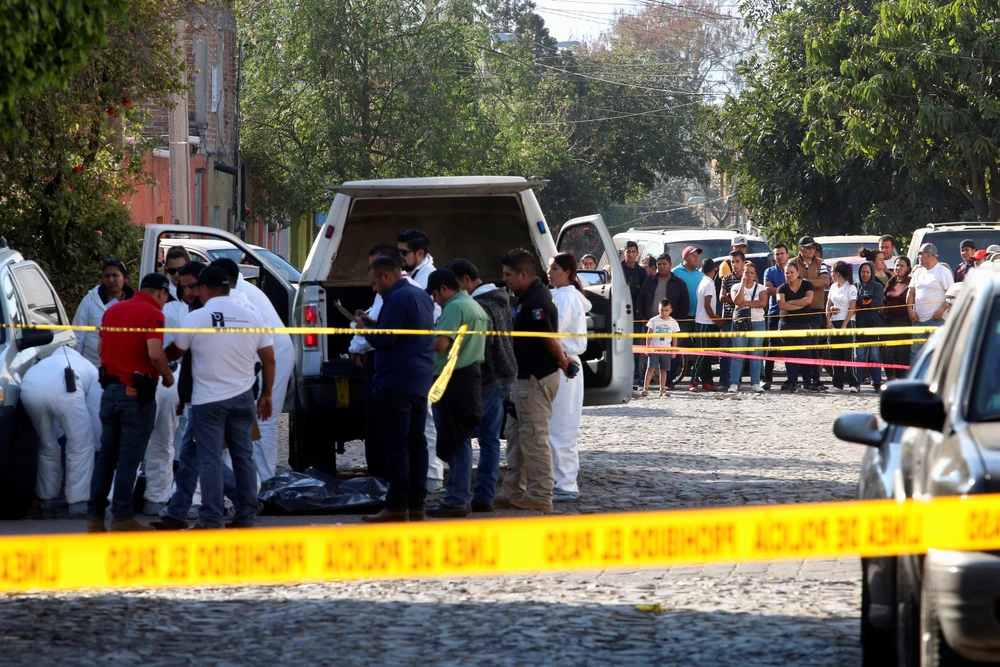 Các chuyên gia pháp y làm việc tại hiện trường vụ án nơi ba người đàn ông bị bắn tại Tlaquepaque, ngoại ô Guadalajara, Mexico vào ngày 10-1. Ảnh: REUTERS