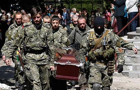 Ngày 7-5 ở Slavyansk (miền Đông Ukraine), lực lượng ly khai tiễn đưa chiến hữu về nơi an nghỉ cuối cùng. Ảnh: NBC