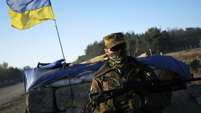 Một binh lính người Ukraine đang đứng tại trạm kiểm soát vùng Schastya, thành phố Luhansk ngày 7-10-2014 (ảnh Reuters)