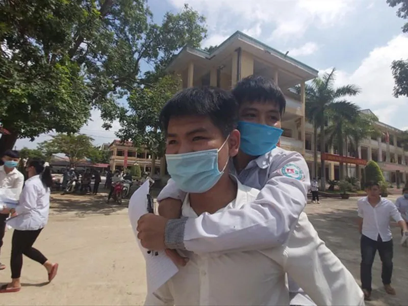 Đôi bạn Hiếu - Minh cõng nhau tới trường thi. Ảnh: PV