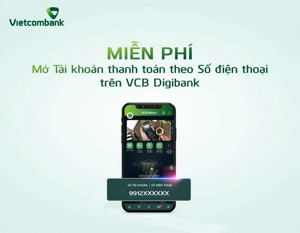 | Bước 1 Đăng nhập vào VCB Digibank | Bước 2 Chọn tính năng “Mở tài khoản thanh toán số chọn” | Bước 3 Nhập 9 số cuối số điện thoại vào mục “Nhập số tìm kiếm theo yêu cầu” | Bước 4 Chọn số tài khoản theo số điện thoại | Bước 5 Xác nhận thông tin và hoàn tất đăng ký |