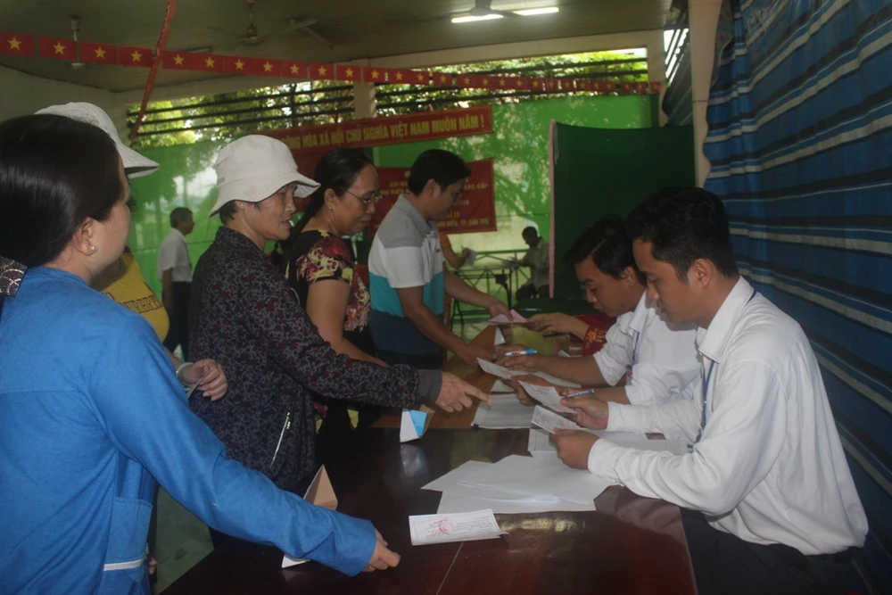 Cử tri nhận phiếu bầu cử tại khu vực bỏ phiếu phường An Khánh, quận Ninh Kiều. Ảnh: GIA TUỆ