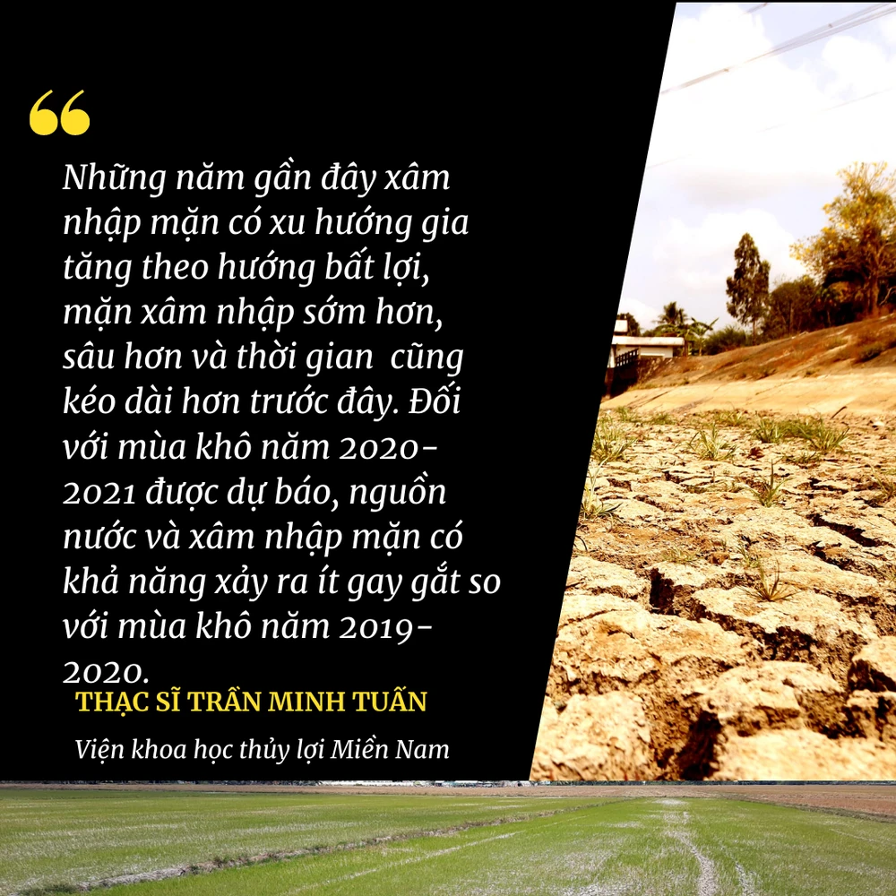 Theo Thạc sĩ Trần Minh Tuấn - Giám đốc Trung tâm thủy nông cấp nước (Viện khoa học thủy lợi Miền Nam) mùa khô năm 2019-2020 được đánh giá là nghiêm trọng nhất từ trước tới nay ở ĐBSCL. Nếu so sánh với đợt hạn mặn 2015-2016 (trước đây gọi là “lịch sử”, cũng rất nghiêm trọng), thì hạn mặn năm 2019-2020 xuất hiện sớm hơn khoảng 1 tháng và thời gian hạn mặn nghiêm trọng trên Đồng bằng kéo dài cả mùa khô (gấp đôi năm 2015-2016).