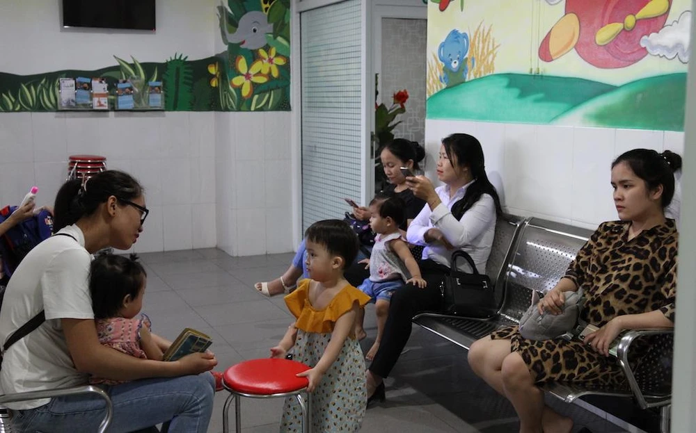 Người nhà đưa trẻ đến khám các bệnh vì nắng nóng. Ảnh: HÀ HẢI.