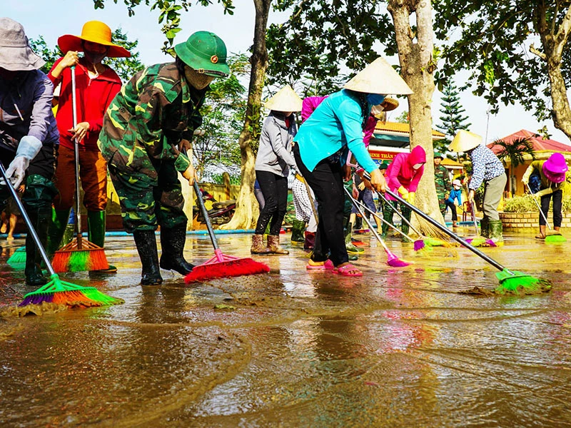 Các trường học bị ngập lụt đang được thầy cô, chính quyền địa phương, lực lượng bộ đội tham gia dọn dẹp.