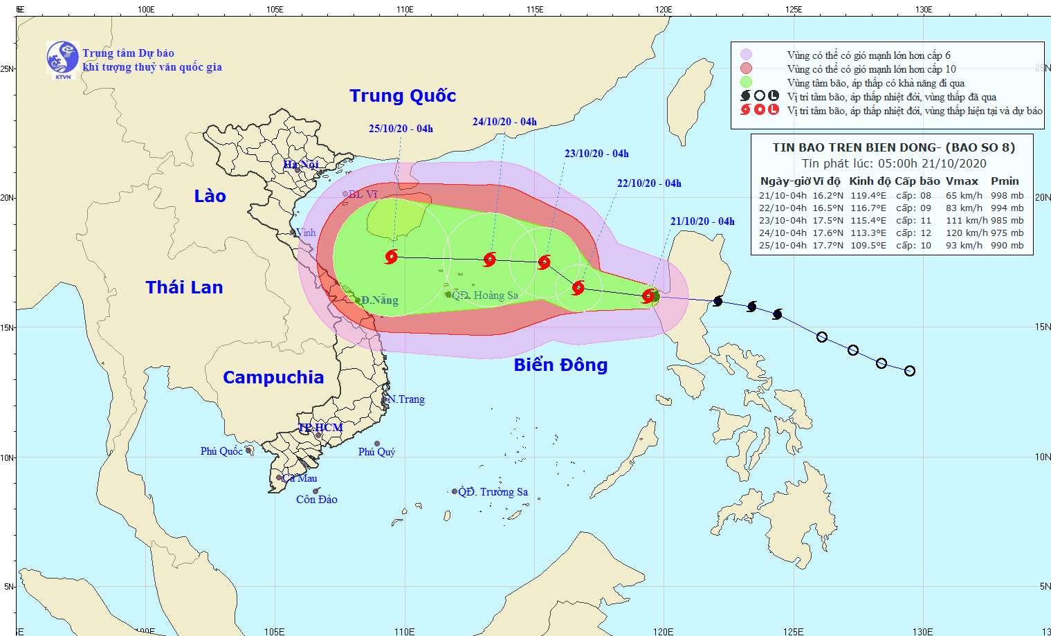 Đến 04 giờ ngày 22-10, vị trí tâm bão ở khoảng 16,5 độ Vĩ Bắc; 116,7 độ Kinh Đông, cách quần đảo Hoàng Sa của Việt Nam khoảng 450km về phía đông đông nam. Sức gió mạnh nhất vùng gần tâm bão mạnh cấp 9 (75-90km/giờ), giật cấp 11.