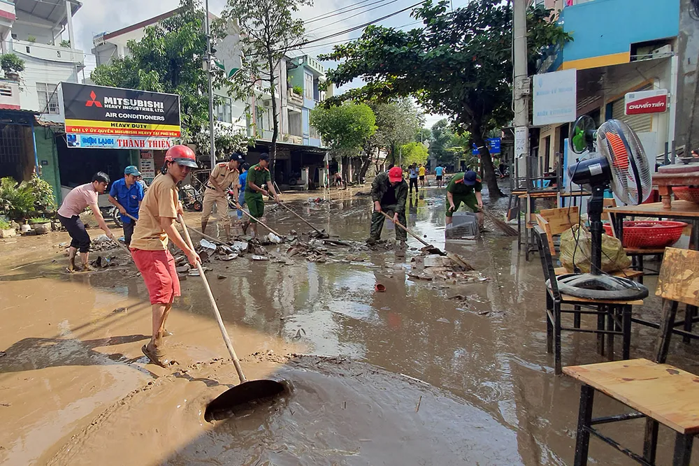 Người dân cùng lực lượng công an dọn dẹp đường phố tại thị trấn La Hai, huyện Đồng Xuân sau khi lũ rút. Ảnh: TRỌNG KHÔI