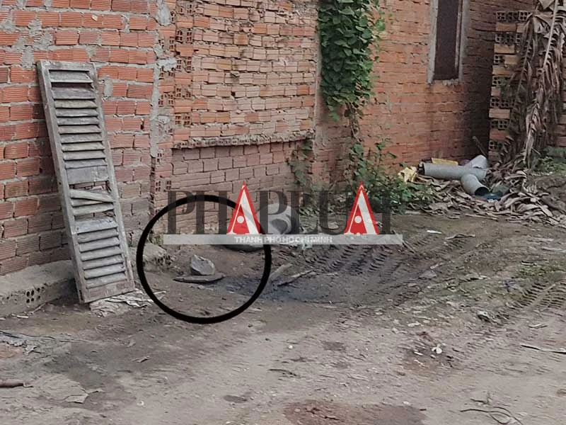 Khi vào bãi đất trống, chúng tôi phát hiện có một miếng gỗ mục nát nằm cách bức tường của nhà dân khoảng 30 cm cùng một cửa sổ gỗ để kế bên, bên trên miếng gỗ có một cục đá đè lên. Lấy chân hất miếng gỗ ra, chúng tôi phát hiện một miệng ống có đường kính 20 cm.