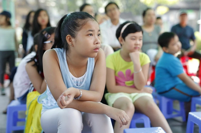 Các bé đến vui chơi ở Nhà Thiếu nhi thành phố chăm chú lắng nghe.