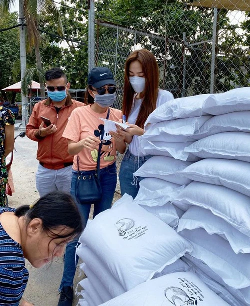 Minh Hằng phát gạo cho người nghèo giữa dịch COVID-19.
