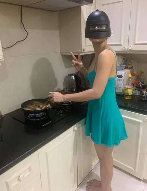 Phương Trinh Jolie vào bếp đội mũ bảo hiểm để rán cá.