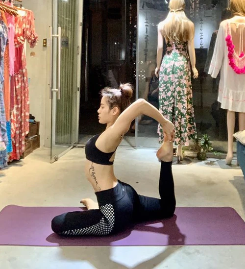 Phương Trinh Jolie tập yoga tại cửa hàng quần áo khi tạm đóng cửa vì dịch.