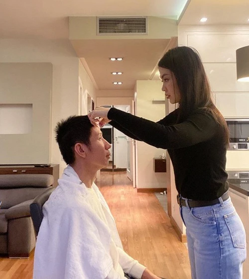 Á hậu Diễm Trang tự tay cắt tóc cho chồng.