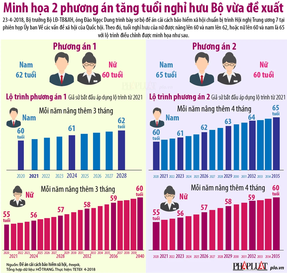 (PLO)- Ngày 23-4, Bộ trưởng LĐ-TB&XH Đào Ngọc Dung trình bày sơ bộ đề án cải cách bảo hiểm xã hội chuẩn bị trình Hội nghị Trung ương 7. Theo đó, tuổi nghỉ hưu của nữ được nâng lên 60 và nam lên 62, hoặc nữ lên 60 và nam là 65 với lộ trình điều chỉnh được minh họa như sau.