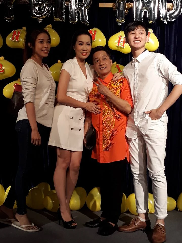 Hai học trò của Minh Nhí là Tiết Cương, Việt Hương cùng nghệ sĩ Kim Xuân, Lương Mỹ đến chúc mừng anh.