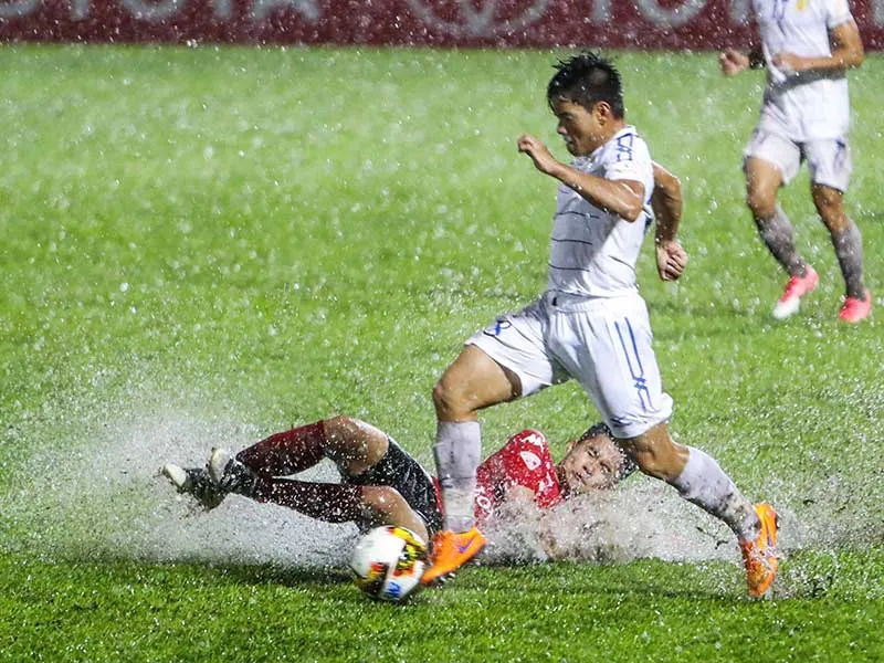Trong trận thua TP.HCM ở lượt trận 14 chiều 24-6, Long An chơi cũng rất tốt, nếu không muốn nói là họ chơi rất có nét nhưng vận may vẫn không mỉm cười với họ. Trận đấu đó ở hiệp 1, trời quang mây tạnh, họ có một thế trận rất tốt và tạm hòa 1-1. Thế nhưng sang đầu hiệp 2, trời đổ mưa như trút suốt hiệp đấu… Thế là Long An lại thua bàn ở hai tình huống sai sót mà phần lớn do mặt sân trơn trượt và bóng ướt.